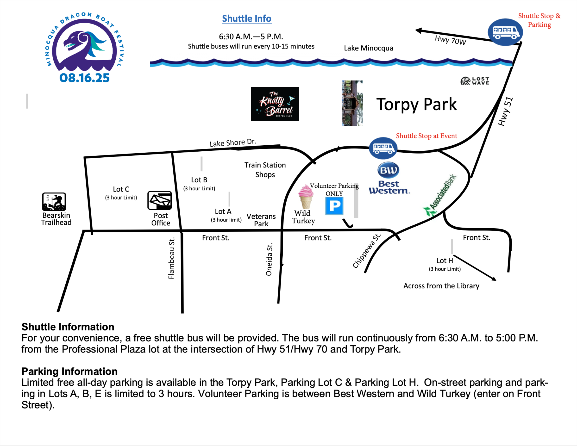 For your convenience a shuttle bus will be provided. The bus will run continuously from 6:30am to 5pm from the Professional Plaza at the intersection of Hwy 51/Hwy 70W (by Home Medical) to and from Torpy Park.